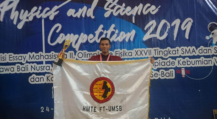 Lagi-lagi Mahasiswa Universitas Muhammadiyah Sumatera Barat Waradzi Mustakim kembali tampil gagah dengan jas merahnya dalam sebuah kejuaraan dan berhasil mengharumkan nama UMSB, kali ini beliau berhasil memperoleh Juara I dalam Kompetisi Essay yang diadakan oleh PASCAL 2019 Phisics and Science Competition yang diadakan di Universitas UDAYANA BALI. dengan tema “Mewadahi Generasi Muda dalam Menumbuhkan Jiwa Kompetitif di Era Revolusi 4,0 Guna MenghasilkanSaintis Muda yang Berkualitas” kegiatan tersebut diikuti lebih dari 100 peserta dari perguruan tinggi seluruh Indonesia.