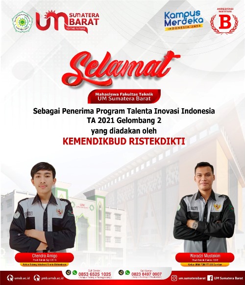 Bukittinggi, FT UM Sumbar - Sebanyak 2 mahasiswa Fakultas Teknik UM Sumbar berhasil lolos seleksi program Talenta Inovasi Indonesia 2021 Gelombang ke 2 yang diadakan oleh KEMENDIKBUD RISTEKDIKTI, Mahasiswa yang lolos merupakan perwakilan dari UKM Pengembangan Penalaran dan Penelitian (P3M).