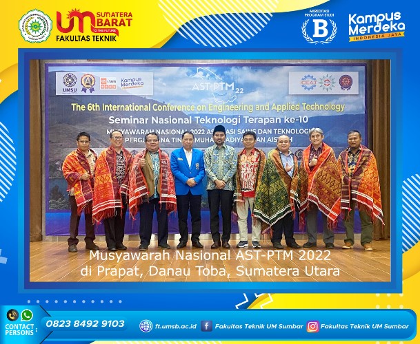 Parapat, ft.umsb.ac.id – Fakultas Teknik UM Sumatera Barat ikut berpartisipasi sebagai co host Musyawarah Nasional Asosiasi Sains dan Teknologi Perguruan Tinggi Muhammadiyah (AST-PTM) tahun 2022 yang diselenggarakan di Hotel Niagara Prapat, Danau Toba Provinsi Sumatera Utara pada 19 Oktober 2022. AST-PTMA akan melakukan pemilihan pengurus untuk periode 2022-2026, dan Internasional Conference on Engineeting and Applied Technology (ICEAT), SNTT, Final KMM-PKMM.